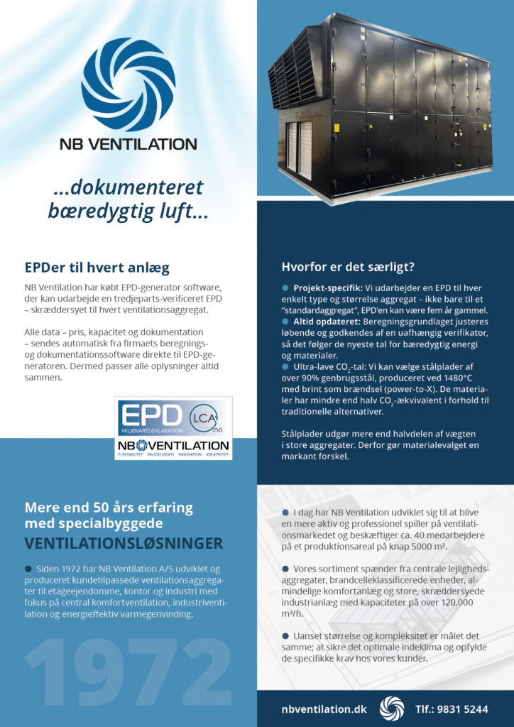 Hos NB Ventilation kan du nu få et hurtigt overblik over, hvem vi er, hvilke ventilationsløsninger vi tilbyder – og hvordan vi sikrer dokumenteret bæredygtighed med EPD’er for hvert anlæg. Tag et kig i folderen og bliv klogere på, hvordan vi skaber sunde og energieffektive indeklimaløsninger.